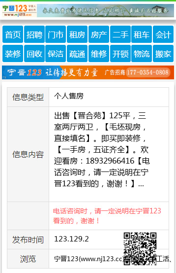 出售【晋合苑】125平,三室两厅两卫,【毛坯现房,直接填名】。即买即装修,【一手房,五证齐全】。欢迎看房:18932966416 【电话咨询时,请一定说明在宁晋123看到的,谢谢!】 |