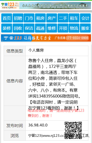 急售个人住房,晶龙小区(晶福苑),172平三室两厅两卫,南北通透,带地下车位和小房,简装可拎包入住,好楼层,紧邻天一广场、六中、八小,有房本。有意详询13483956006微信同号。 【电话咨询时,请一定说明在宁晋123看到的,谢谢!】 |