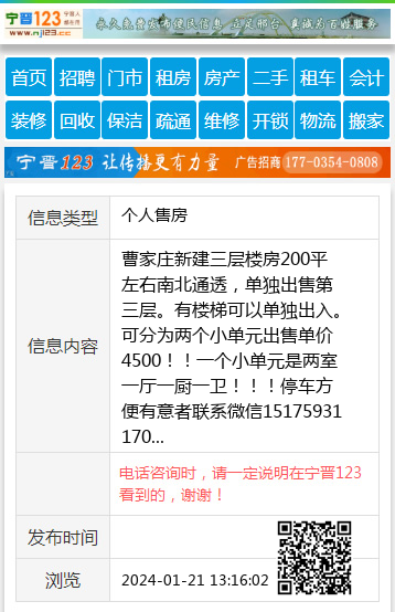 曹家庄新建三层楼房200平左右南北通透,单独出售第三层。有楼梯可以单独出入。可分为两个小单元出售单价4500!!一个小单元是两室一厅一厨一卫!!!停车方便有意者联系微信15175931170 【电话咨询时,请一定说明在宁晋123看到的,谢谢!】 |