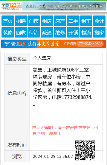 急售,上城悦府106平三室精装现房,带车位小房,中间好楼层,有房本,可过户贷款,首付即可入住!三小学区房,电话17732988874 【电话咨询时,请一定说明在宁晋123看到的,谢谢!】 |