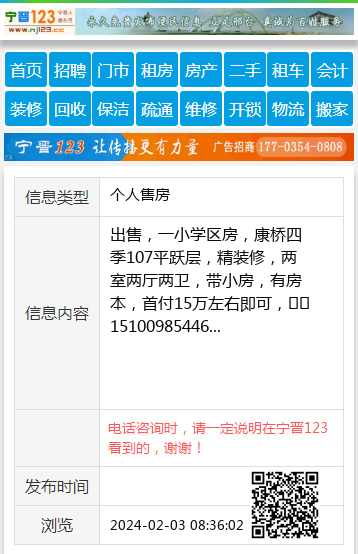 出售,一小学区房,康桥四季107平跃层,精装修,两室两厅两卫,带小房,有房本,首付15万左右即可,☎️15100985446 【电话咨询时,请一定说明在宁晋123看到的,谢谢!】 |