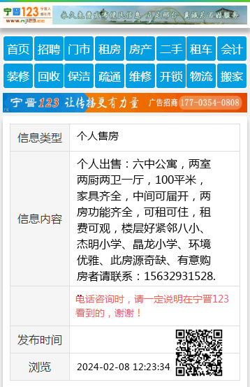个人出售:六中公寓,两室两厨两卫一厅,100平米,家具齐全,中间可届开,两房功能齐全,可租可住,租费可观,楼层好紧邻八小、杰明小学、晶龙小学、环境优雅、此房源奇缺、有意购房者请联系:15632931528 【电话咨询时,请一定说明在宁晋123看到的,谢谢!】 |