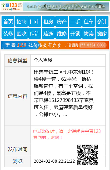 出售宁纺二区七中东侧10号楼4楼一套,62平米,断桥铝新窗户,有三个空调,我们是4楼,最高是五楼,不带电梯15127998433带家具可入住,房屋建筑质量很好,公摊也小。 【电话咨询时,请一定说明在宁晋123看到的,谢谢!】 |
