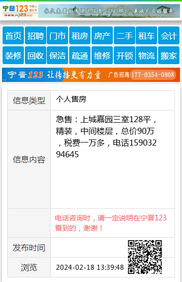 急售:上城嘉园三室128平,精装,中间楼层,总价90万,税费一万多,电话15903294645