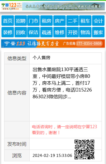 出售水墨庭院130平通透三室,中间最好楼层带小房80万,房本马上满二,首付17万,看房方便,电话☎15226863023微信同步 【电话咨询时,请一定说明在宁晋123看到的,谢谢!】 |