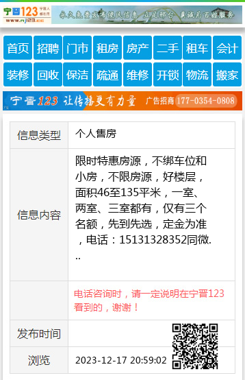 限时特惠房源,不绑车位和小房,不限房源,好楼层,面积46至135平米,一室、两室、三室都有,仅有三个名额,先到先选,定金为准,电话:15131328352同微 【电话咨询时,请一定说明在宁晋123看到的,谢谢!】 |