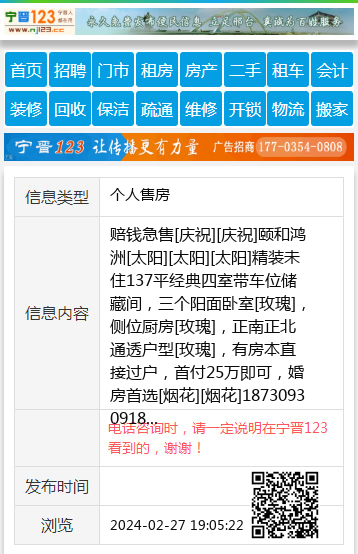 赔钱急售[庆祝][庆祝]颐和鸿洲[太阳][太阳][太阳]精装未住137平经典四室带车位储藏间,三个阳面卧室[玫瑰],侧位厨房[玫瑰],正南正北通透户型[玫瑰],有房本直接过户,首付25万即可,婚房首选[烟花][烟花]18730930918 【电话咨询时,请一定说明在宁晋123看到的,谢谢!】 |