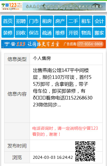 出售燕南公馆147平中间楼层,报价110万可谈,首付55万即可,含拿钥匙,带子母车位,即买即装修,有🔑看房电话☎15226863023微信同步 【电话咨询时,请一定说明在宁晋123看到的,谢谢!】 |
