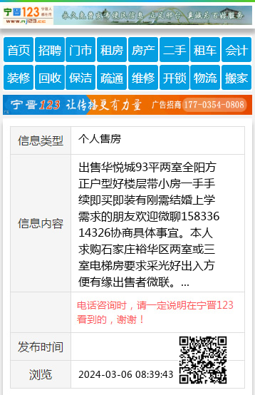 出售华悦城93平两室全阳方正户型好楼层带小房一手手续即买即装有刚需结婚上学需求的朋友欢迎微聊15833614326协商具体事宜。本人求购石家庄裕华区两室或三室电梯房要求采光好出入方便有缘出售者微联。 【电话咨询时,请一定说明在宁晋123看到的,谢谢!】 |