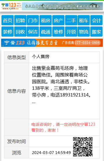 出售紫金嘉苑毛坯房,地理位置绝佳。周围挨着商场公园医院。南北通透,非楼头。138平米,三室两厅两卫,带小房,电话18931921314。 【电话咨询时,请一定说明在宁晋123看到的,谢谢!】 |