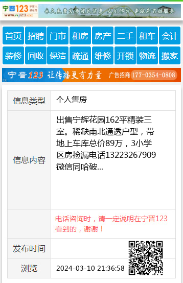 出售宁辉花园162平精装三室。稀缺南北通透户型,带地上车库总价89万,3小学区房捡漏电话13223267909微信同哈破 【电话咨询时,请一定说明在宁晋123看到的,谢谢!】 |