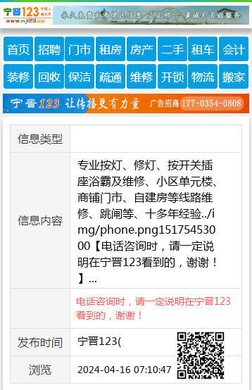 专业按灯、修灯、按开关插座浴霸及维修、小区单元楼、商铺门市、自建房等线路维修、跳闸等、十多年经验../img/phone.png15175453000 【电话咨询时,请一定说明在宁晋123看到的,谢谢!】 |
