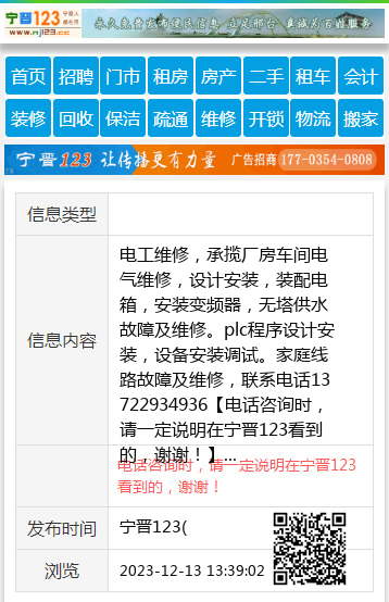 电工维修,承揽厂房车间电气维修,设计安装,装配电箱,安装变频器,无塔供水故障及维修。plc程序设计安装,设备安装调试。家庭线路故障及维修,联系电话13722934936 【电话咨询时,请一定说明在宁晋123看到的,谢谢!】 |