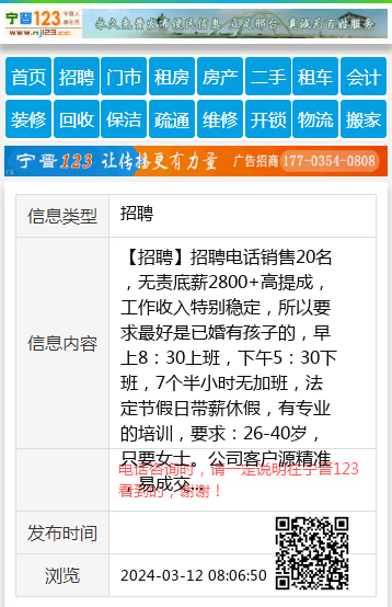 【招聘】招聘电话销售20名,无责底薪2800+高提成,工作收入特别稳定,所以要求最好是已婚有孩子的,早上8:30上班,下午5:30下班,7个半小时无加班,法定节假日带薪休假,有专业的培训,要求:26-40岁,只要女士。公司客户源精准,易成交。工作地点:老车站正泰大厦,联系电话:15369992789 【电话咨询时,请一定说明在宁晋123看到的,谢谢!】 |