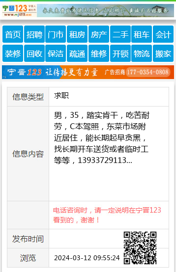 男,35,踏实肯干,吃苦耐劳,C本驾照,东菜市场附近居住,能长期起早贪黑,找长期开车送货或者临时工等等,13933729113 【电话咨询时,请一定说明在宁晋123看到的,谢谢!】 |