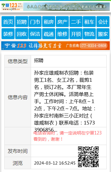 孙家庄雄威制衣招聘:包装男工1名、女工2名,裁剪1名,锁订2名。本厂常年生产男士休闲裤。活简单易上手。工作时间:上午8点~12点,下午2点~7点。地址:孙家庄村南新三小正对过(雄威制衣)联系电话:15733906856 【电话咨询时,请一定说明在宁晋123看到的,谢谢!】 |