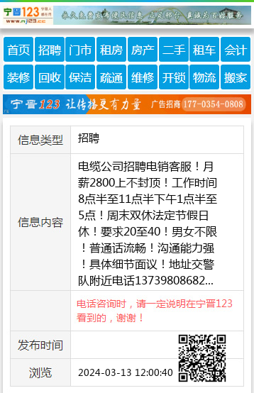 电缆公司招聘电销客服!月薪2800上不封顶!工作时间8点半至11点半下午1点半至5点!周末双休法定节假日休!要求20至40!男女不限!普通话流畅!沟通能力强!具体细节面议!地址交警队附近电话13739808682 【电话咨询时,请一定说明在宁晋123看到的,谢谢!】 |