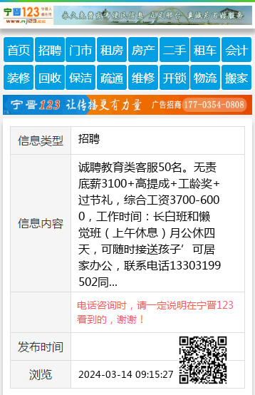 诚聘教育类客服50名。无责底薪3100+高提成+工龄奖+过节礼,综合工资3700-6000,工作时间:长白班和懒觉班(上午休息)月公休四天,可随时接送孩子’可居家办公,联系电话13303199502同 【电话咨询时,请一定说明在宁晋123看到的,谢谢!】 |