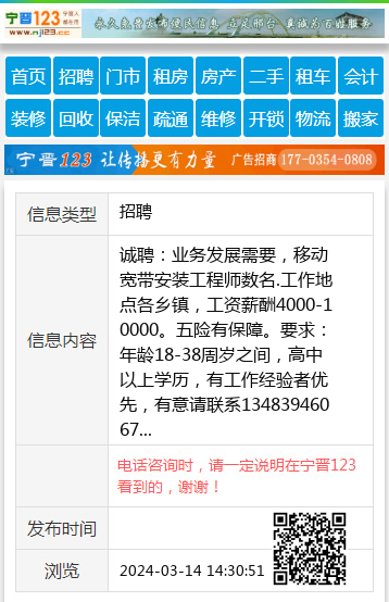 诚聘:业务发展需要,移动宽带安装工程师数名.工作地点各乡镇,工资薪酬4000-10000。五险有保障。要求:年龄18-38周岁之间,高中以上学历,有工作经验者优先,有意请联系13483946067 【电话咨询时,请一定说明在宁晋123看到的,谢谢!】 |