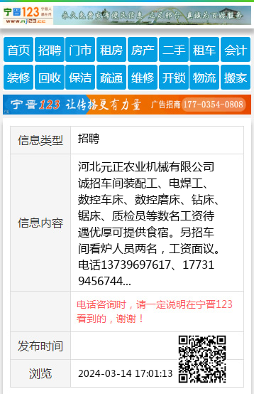 河北元正农业机械有限公司诚招车间装配工、电焊工、数控车床、数控磨床、钻床、锯床、质检员等数名工资待遇优厚可提供食宿。另招车间看炉人员两名,工资面议。电话13739697617、177319456744 【电话咨询时,请一定说明在宁晋123看到的,谢谢!】 |