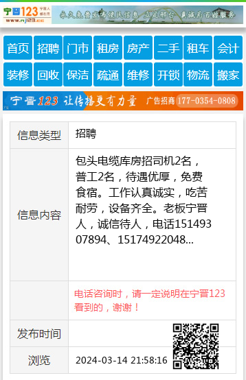 包头电缆库房招司机2名,普工2名,待遇优厚,免费食宿。工作认真诚实,吃苦耐劳,设备齐全。老板宁晋人,诚信待人,电话15149307894、15174922048 【电话咨询时,请一定说明在宁晋123看到的,谢谢!】 |