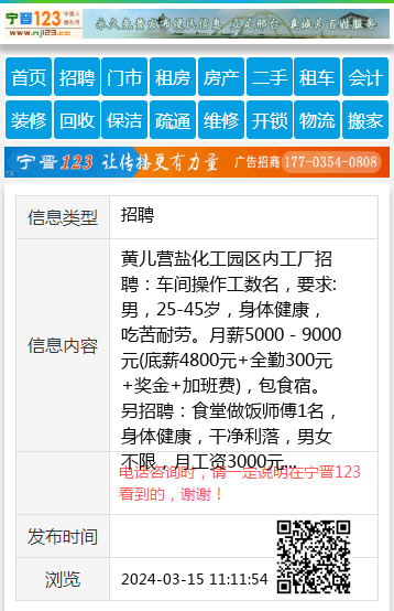 黄儿营盐化工园区内工厂招聘:车间操作工数名,要求:男,25-45岁,身体健康,吃苦耐劳。月薪5000-9000元(底薪4800元+全勤300元+奖金+加班费),包食宿。另招聘:食堂做饭师傅1名,身体健康,干净利落,男女不限,月工资3000元,锅炉工1名,月工资4500-9000元,联系电话:15343199088,18103395878 【电话咨询时,请一定说明在宁晋123看到的,谢谢!】 |