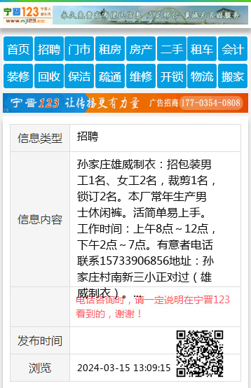孙家庄雄威制衣:招包装男工1名、女工2名,裁剪1名,锁订2名。本厂常年生产男士休闲裤。活简单易上手。工作时间:上午8点~12点,下午2点~7点。有意者电话联系15733906856地址:孙家庄村南新三小正对过(雄威制衣)。 【电话咨询时,请一定说明在宁晋123看到的,谢谢!】 |