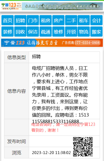电缆厂招聘销售人员,日工作八小时,单休,男女不限,要求有上进心,工作地点宁晋县城,有工作经验者优先录用,工资面议。你有能力,我有钱,来到这里,让你更多的付出,得到更有价值的回报。应聘电话:1513115588815333116888 【电话咨询时,请一定说明在宁晋123看到的,谢谢!】 |