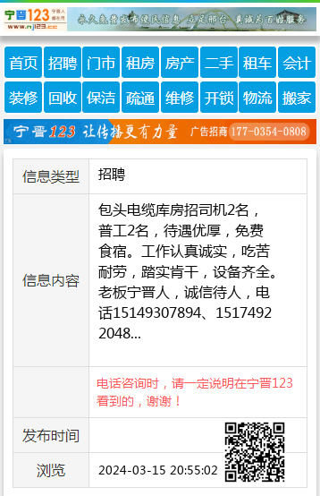 包头电缆库房招司机2名,普工2名,待遇优厚,免费食宿。工作认真诚实,吃苦耐劳,踏实肯干,设备齐全。老板宁晋人,诚信待人,电话15149307894、15174922048 【电话咨询时,请一定说明在宁晋123看到的,谢谢!】 |