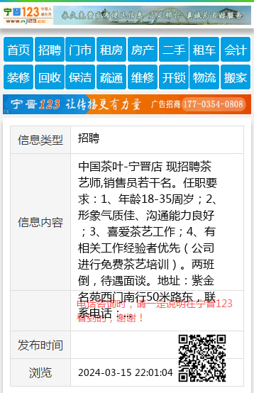 中国茶叶-宁晋店 现招聘茶艺师,销售员若干名。任职要求:1、年龄18-35周岁;2、形象气质佳、沟通能力良好;3、喜爱茶艺工作;4、有相关工作经验者优先(公司进行免费茶艺培训)。两班倒,待遇面谈。地址:紫金名苑西门南行50米路东,联系电话:武女士17731922258,赵先生13730484623 【电话咨询时,请一定说明在宁晋123看到的,谢谢!】 |