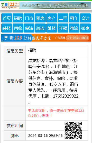 晶龙招聘:晶龙地产物业招聘保安20名,工作地点:江苏东台市(沿海城市),提供住宿、食补、保险,要求身体健康、45岁以下,退伍军人优先,一经录用,待遇优厚,电话:17692929922