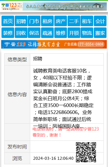 诚聘教育类电话客服10名,女,40周以下经验不限;逻辑清晰会说普通话;工作踏实认真勤奋;底薪2800提成奖金长白班月公休4天;综合工资3500一6000长期稳定;电话15226860606。业务简单新职场;面试通过后统一培训;凤城国际A座 【电话咨询时,请一定说明在宁晋123看到的,谢谢!】 |