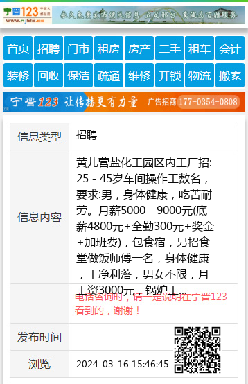 黄儿营盐化工园区内工厂招:25-45岁车间操作工数名,要求:男,身体健康,吃苦耐劳。月薪5000-9000元(底薪4800元+全勤300元+奖金+加班费),包食宿,另招食堂做饭师傅一名,身体健康,干净利落,男女不限,月工资3000元,锅炉工一名,月工资4500-9000元,联系电话15343199088 18103395878