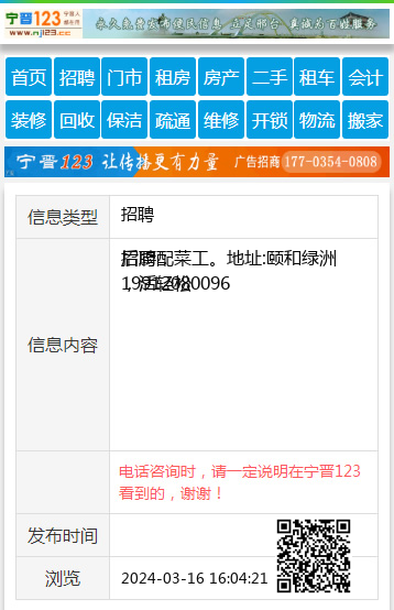 招聘: 后厨配菜工。地址:颐和绿洲,活轻松 19912080096