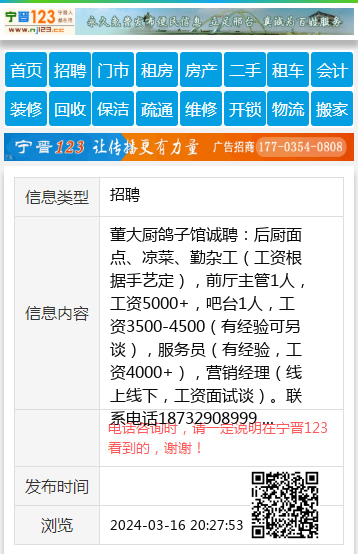 董大厨鸽子馆诚聘:后厨面点、凉菜、勤杂工(工资根据手艺定),前厅主管1人,工资5000+,吧台1人,工资3500-4500(有经验可另谈),服务员(有经验,工资4000+),营销经理(线上线下,工资面试谈)。联系电话18732908999 刘经理 【电话咨询时,请一定说明在宁晋123看到的,谢谢!】 |