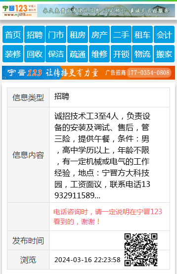 诚招技术工3至4人,负责设备的安装及调试、售后,管三险,提供午餐,条件:男,高中学历以上,年龄不限,有一定机械或电气的工作经验,地点:宁晋方大科技园,工资面议,联系电话13932911589 【电话咨询时,请一定说明在宁晋123看到的,谢谢!】 |