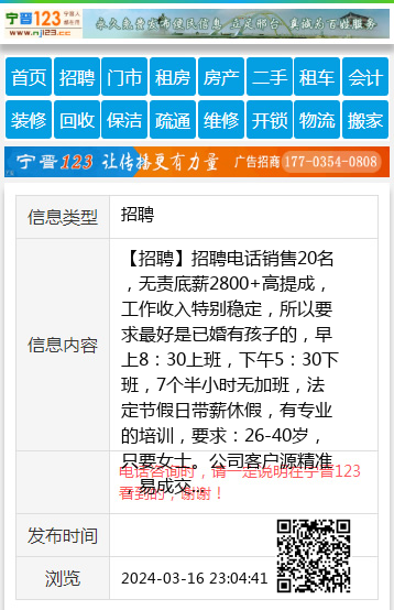 【招聘】招聘电话销售20名,无责底薪2800+高提成,工作收入特别稳定,所以要求最好是已婚有孩子的,早上8:30上班,下午5:30下班,7个半小时无加班,法定节假日带薪休假,有专业的培训,要求:26-40岁,只要女士。公司客户源精准,易成交。工作地点:老车站正泰大厦,联系电话:15369992789 【电话咨询时,请一定说明在宁晋123看到的,谢谢!】 |