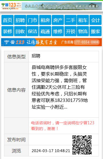 县城电商聘拼多多客服限女性,要求长期稳定,头脑灵活接受能力强,需倒班,管住满勤2天公休可上三险有经验优先考虑,只招长期有意者可联系18233017759地址实验一小附近 【电话咨询时,请一定说明在宁晋123看到的,谢谢!】 |
