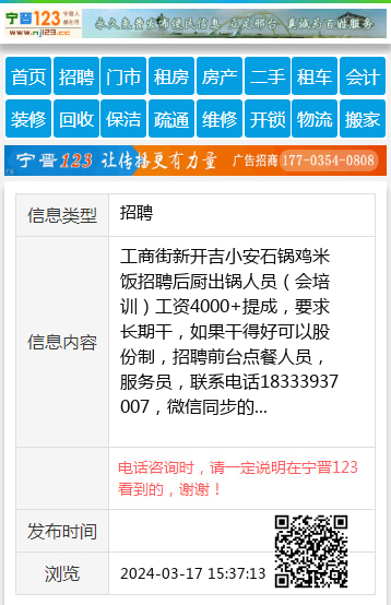 工商街新开吉小安石锅鸡米饭招聘后厨出锅人员(会培训)工资4000+提成,要求长期干,如果干得好可以股份制,招聘前台点餐人员,服务员,联系电话18333937007,微信同步的 【电话咨询时,请一定说明在宁晋123看到的,谢谢!】 |