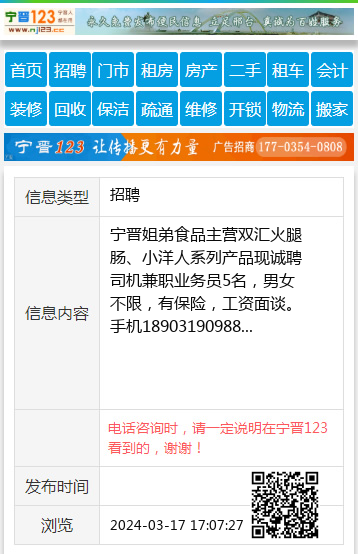 宁晋姐弟食品主营双汇火腿肠、小洋人系列产品现诚聘司机兼职业务员5名,男女不限,有保险,工资面谈。手机18903190988 【电话咨询时,请一定说明在宁晋123看到的,谢谢!】 |