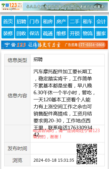 汽车摩托配件加工要长期工,稳定踏实肯干,工作简单不累基本都是坐着,早八晚6.30午休一个半小时,管吃,一天120基本工资看个人能力有上涨空间工作之余也可销售配件高提成,工资月结要求男20-30,工作地点西王里,联系电话17633093442 【电话咨询时,请一定说明在宁晋123看到的,谢谢!】 |