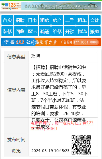 【招聘】招聘电话销售20名;无责底薪2800+高提成,工作收入特别稳定,所以要求最好是已婚有孩子的,早上8:30上班,下午5:30下班,7个半小时无加班,法定节假日带薪休假,有专业的培训,要求:26-40岁,只要女士。公司客户源精准,易成交。联系电话: