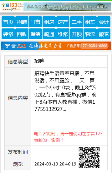 招聘快手语音室直播,不用说话,不用露脸,一天一算,一个小时10块,晚上8点50到2点,有直播进qq群,晚上8点多有人教直播,微信17755132927