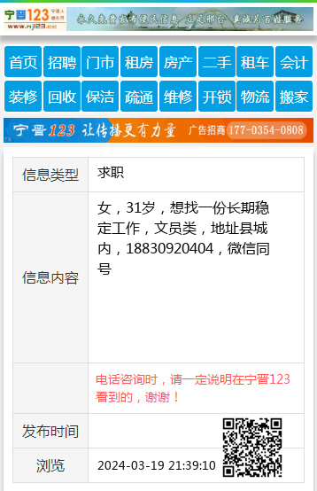 女,31岁,想找一份长期稳定工作,文员类,地址县城内,18830920404,微信同号