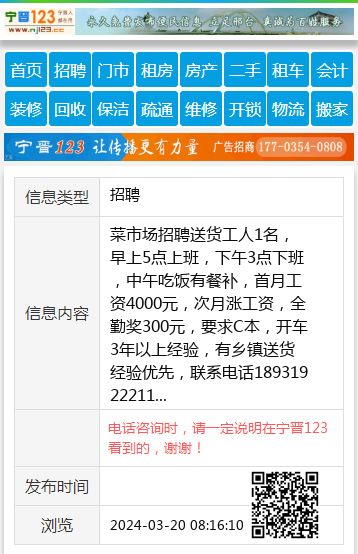 菜市场招聘送货工人1名,早上5点上班,下午3点下班,中午吃饭有餐补,首月工资4000元,次月涨工资,全勤奖300元,要求C本,开车3年以上经验,有乡镇送货经验优先,联系电话18931922211 【电话咨询时,请一定说明在宁晋123看到的,谢谢!】 |