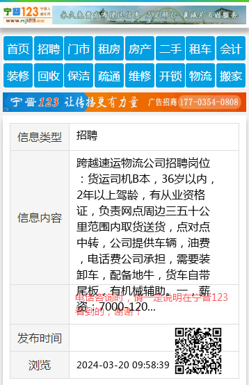 跨越速运物流公司招聘岗位:货运司机B本,36岁以内,2年以上驾龄,有从业资格证,负责网点周边三五十公里范围内取货送货,点对点中转,公司提供车辆,油费,电话费公司承担,需要装卸车,配备地牛,货车自带尾板,有机械辅助。一,薪资:7000-12000元,上不封顶,多劳多得。二,待遇:1.受享假期:月休四天,依法享法带薪年假,婚假,病假等假期。2.速快晋升:提供完善的内部竞聘转岗机制,定期举办内部竞聘。3.供提住宿4.工龄奖金:满一年工龄奖200元/月,2年400/月,3年及以上600元/月。5.提供培训:提供入职培训,岗位技能培训,管理能力培训。以上岗位为企业直招不收取何任费用地址:宁晋县荆里庄东口,电话18713970203 【电话咨询时,请一定说明在宁晋123看到的,谢谢!】 |