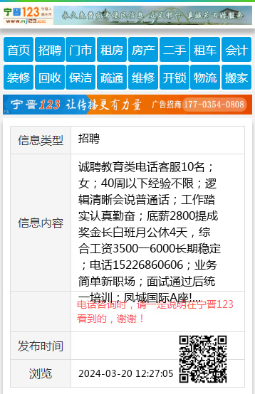 诚聘教育类电话客服10名;女;40周以下经验不限;逻辑清晰会说普通话;工作踏实认真勤奋;底薪2800提成奖金长白班月公休4天,综合工资3500一6000长期稳定;电话15226860606;业务简单新职场;面试通过后统一培训;凤城国际A座!