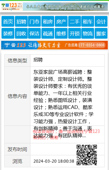 东亚家居广场高薪诚聘:整装设计师、定制设计师。整装设计师要求:有优秀的谈单能力、一年以上相关行业经验;熟悉图纸设计,装潢设计;熟悉运用CAD、酷家乐或3D等专业设计软件;学习能力强,热爱设计工作,有创新精神;善于沟通,表达能力强,有团队精神。定制设计师要求:熟练掌握CAD、酷家乐或圆方等定制设计相关软件,一年以上相关行业经验。薪资面谈,联系电话:18730999203 【电话咨询时,请一定说明在宁晋123看到的,谢谢!】 |