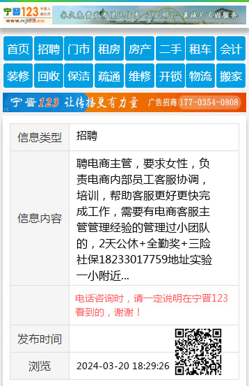 聘电商主管,要求女性,负责电商内部员工客服协调,培训,帮助客服更好更快完成工作,需要有电商客服主管管理经验的管理过小团队的,2天公休+全勤奖+三险社保18233017759地址实验一小附近 【电话咨询时,请一定说明在宁晋123看到的,谢谢!】 |