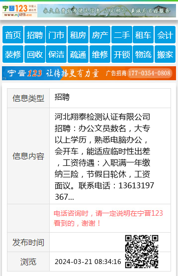 河北翔泰检测认证有限公司招聘:办公文员数名,大专以上学历,熟悉电脑办公,会开车,能适应临时性出差,工资待遇:入职满一年缴纳三险,节假日轮休,工资面议。联系电话:13613197367 【电话咨询时,请一定说明在宁晋123看到的,谢谢!】 |
